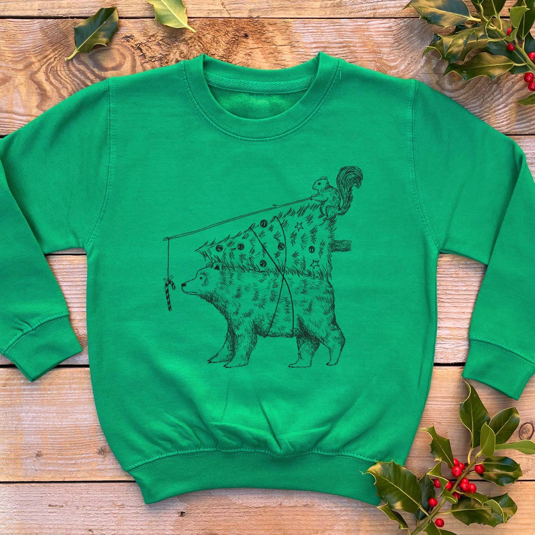 green kids jumper with bear carrying xmas tree