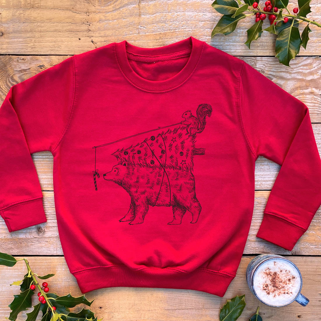 red kids xmas jumper with bear carrying xmas tree