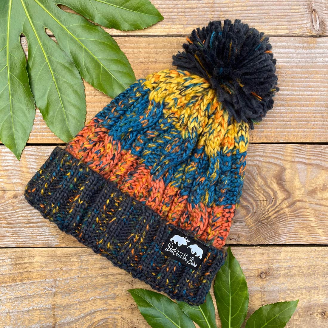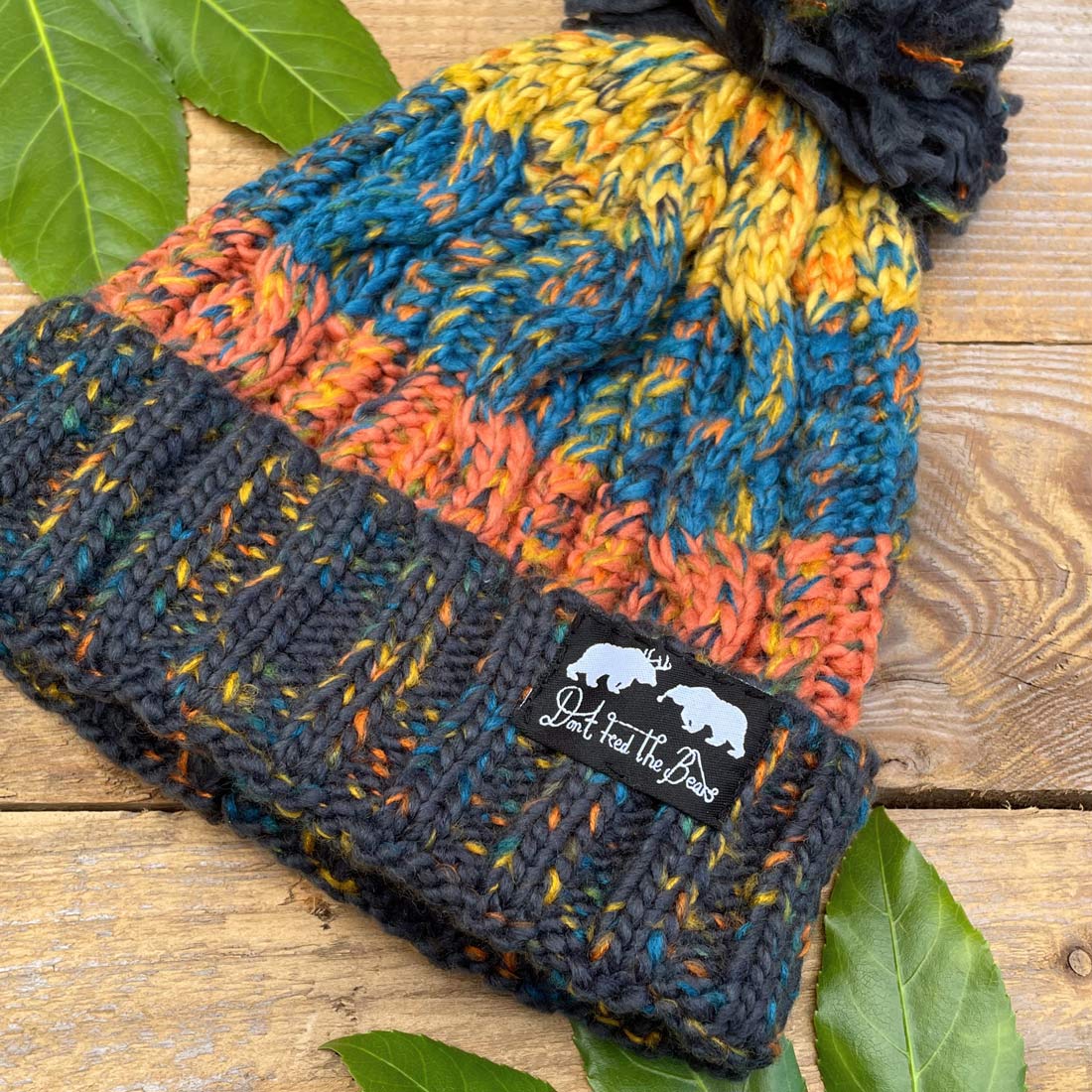 orange and blue bobble hat